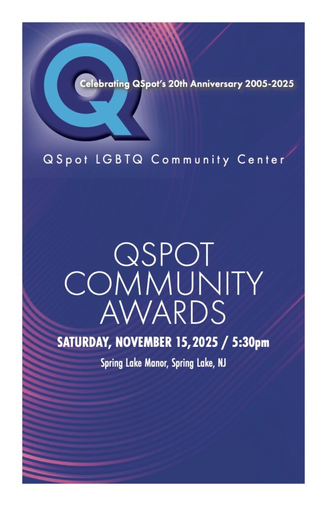 Please join us for the QSpot Community Awards, Sat., Nov. 15, 2025! The event will recognize 5 honorees for their significant contributions to the LGBTQ and allied community and QSpot. We’ll also be celebrating QSpot’s 20th year anniversary. The dinner and ceremony will take place at the beautiful Spring Lake Manor, Spring Lake, NJ. All proceeds support the on-going operations and programs at QSpot’s home in Asbury Park! We hope you can join us!